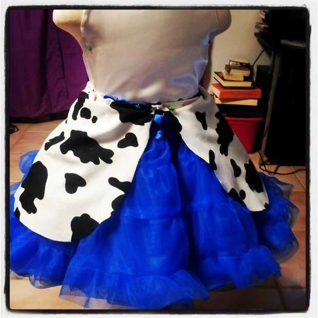 Con el fin de crear la vaca chap impresión Jessie se tomó inspiración de vestido de Cenicienta. ¿Sabes esas cosas de dos lado que tiene sucediendo? Lo hice con cowprint grueso jesery! Su cintura pequeña que una mera 20inches por lo que fueron 10inches ancho en la parte superior y desplegable en forma de gota de lágrima. PIN (si puedes) y jugar con las formas que funcionan para usted.
