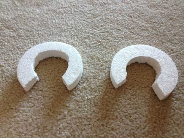 Tomar los dos discos de espuma y usan un cuchillo xacto (o un cuchillo de la caja) para cortar un agujero en el centro del disco, además de cortan una pieza para hacer la forma de 'C'.