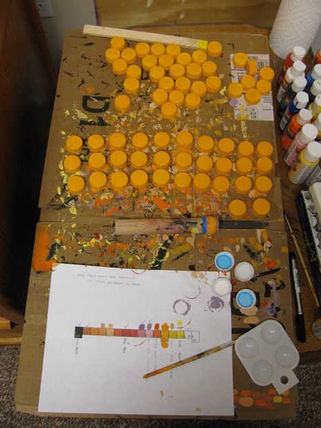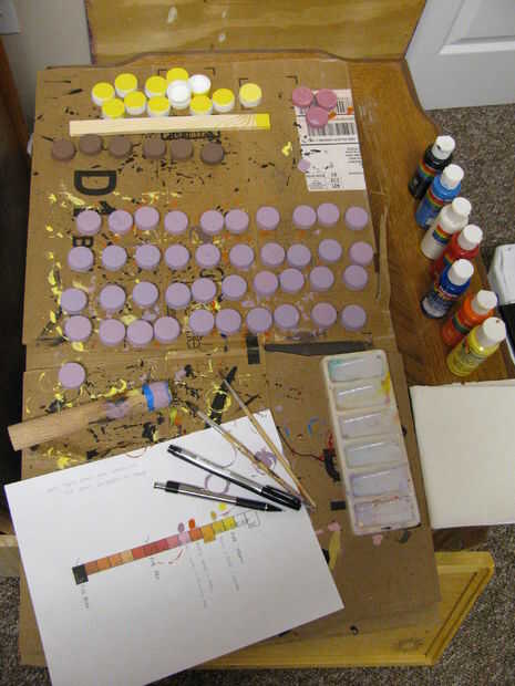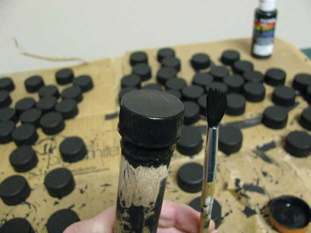 Utilizando la paleta de colores impresa, luego pintados a mano cada tapa con pintura acrílica. Por ejemplo, pinté capuchón negro 237, 117 naranja, etc.. Pintar las tapas era tedioso y requiere mucho tiempo y he tenido que "desarrollar" una herramienta especial para ayudar con el proceso de pintura. He utilizado un taco de madera de 3/4" con cinta de pintor en un extremo. Las tapas de caben estrechamente en el extremo de la tapa para que no caigan mientras pintura y fácilmente estallar para el secado.