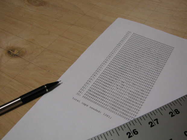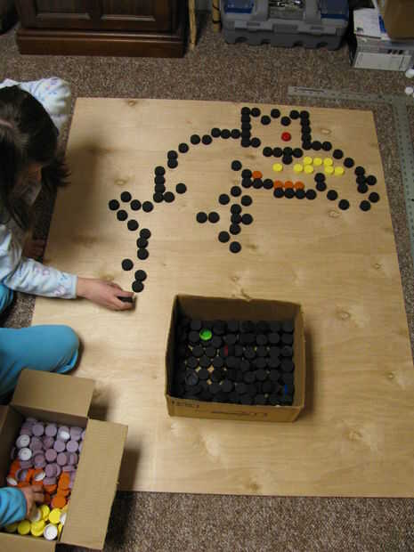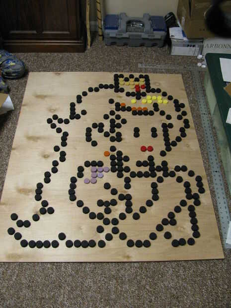 Fue en este momento que me di cuenta de cuán grande esta foto iba a ser. Cada tapa es de aproximadamente 31mm de diámetro. Dado que todas las tapas son un poco diferentes, configurar la red para plazas de 33mm. La imagen final se terminó en 3 pies de ancho por 4 pies de altura! No es exactamente algo puede guardar en su escritorio.