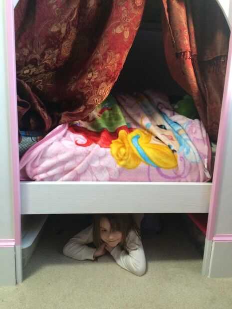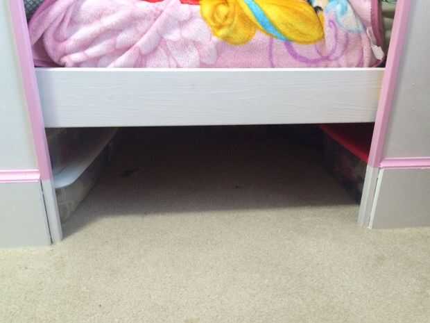 También hay un espacio considerable debajo de la cama para el almacenamiento. La chica también se adapta bien debajo de la cama. Ella llama la "mazmorra" y que "la gente mala debe ir allí". ¿Tal vez debo hacer una reja de metal falsa para ir sobre la entrada al almacenamiento debajo de la cama?