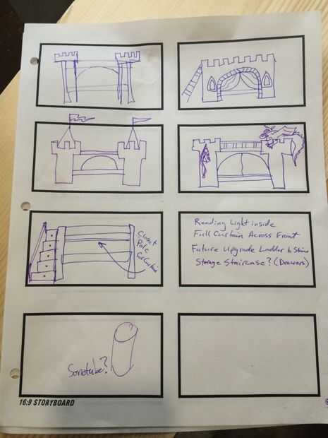 Había bosquejado imágenes en "miniatura" de lo que podría ser el proyecto terminado. Dibujaba varias formas de Castillo de estilo diferente y marcado por alguna idea que tenía. Agachándose sobre el papel me ayudaría a recordar alguna ideas que de lo contrario se pierde y me deja Mostrar mis ideas a otras personas para obtener aportes adicionales.