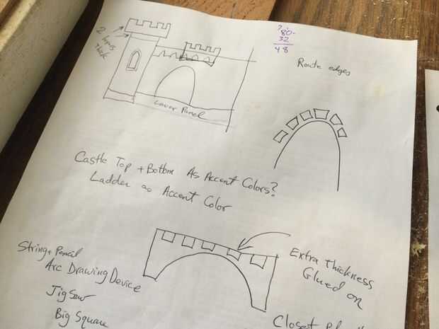 Después de varios bocetos, he decidido que el castillo debería tener dos torres de proporciones más bien gruesas y un arco que conecta los dos. La parte superior de cada torre tendría castellations, o parapetos decorativos con muescas espaciadas regularmente. En el centro de cada torre sería una ventana en forma de arco gótico. Esa ventana le permitiría a la niña para mirar hacia fuera, y el alféizar de la ventana actuar como un pequeño estante o lugar para establecer una muñeca.