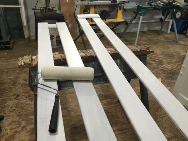 Monté la cama encima de trozos de 2 x 4. Me permitiera pintar hasta la parte inferior. Esta cama no tiene patas. Por el contrario, todo el ancho de la cabecera y el tablero de pie pone en el suelo. Esto es bueno para ayudar a estirar el peso de la cama, pero haría más difícil la pintura.