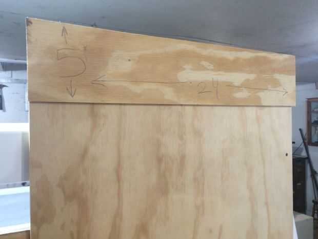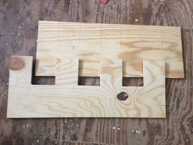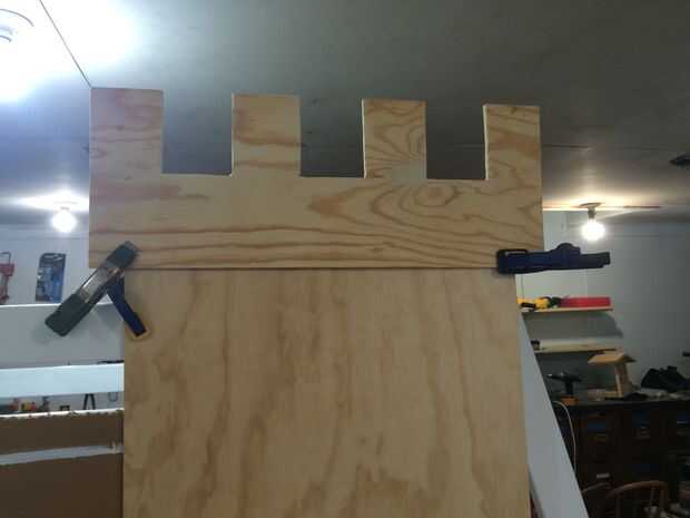 Como era un poco más lejos a lo largo del proyecto, sentí que la parte superior de la torre parece más tridimensional por espacio simplemente hacia fuera la parte superior. Corté dos trozos de madera de desecho a 28 pulgadas de ancho por 5 pulgadas de alto. Los tableros iría detrás de la parte superior de la torre. Fueron clavados en la pistola de corte, entonces el superior de la torre de castillo fue clavada sobre encima de eso. La superficie de la parte superior de la torre era así una pulgada lejos de la columna principal de la torre, dándole un poco de profundidad.