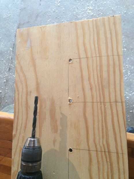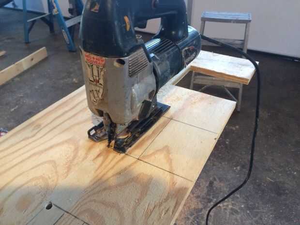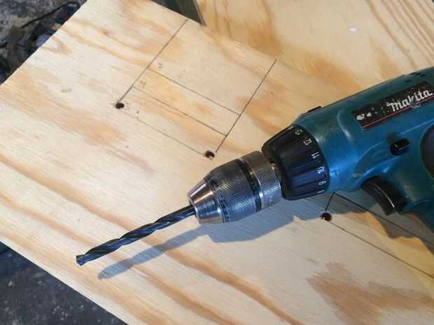 Taladré agujeros en las esquinas de las ranuras con una broca lo suficientemente grande como para caber en la hoja de la Sierra de vaivén. Así, podía fácilmente hacer la Cruz cortada con la sierra caladora. Después del corte, trazó el primer superior de la torre en la segunda placa, luego que una corte así.