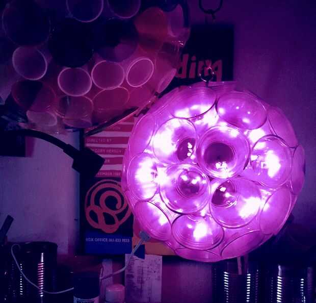 Para Halloween he decidido reutilizar un viejo sparkleball. Tomó aparte, lava las tazas y consiguió suministros listo.taladrola grapadora alicate + grapaspintura de acrílico negro150 luces naranja y negrasziptie + gancho para colgar50 reciclado plást