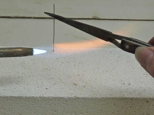 La fianza se crea fuera de cable calibre 14 fastidiando un extremo (imagen 19) y forja el otro plano (imagen 20). Archivo, esmeril y pulir ambos extremos. Taladrar un agujero lo suficientemente grande como para enhebrar el extremo forjado a través, use sus dedos y madera esviados para enrollamiento de alambre (imagen 21)
