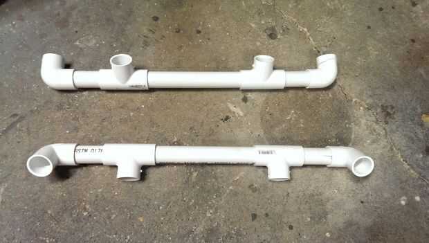 En primer lugar, hacer que la barra superior y el frontal, que requiere 4 x 2 3/4" piezas laterales y un pedazo de centro de 7 1/4". Con la 1 1/8" longitud de inserción en los accesorios que la longitud total 24". Cada barra se hizo con un 90 grados en cada extremo, tubos más cortos de las piezas de 90 grados a las tes y, a continuación, la pieza más larga en el medio.