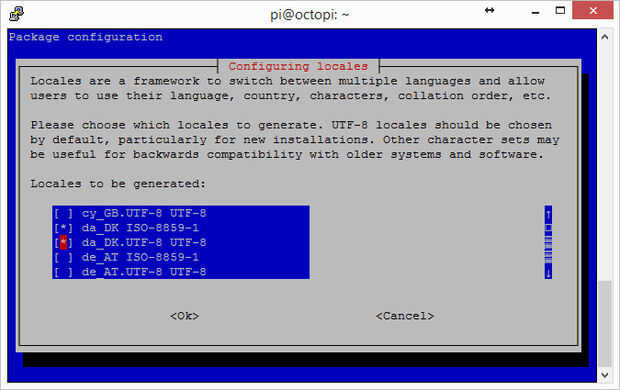 Ahora nos pide seleccionar la configuración regional predeterminada de nuestro medio ambiente. Ver arriba y selecciono da_DK y presiona ENTER.