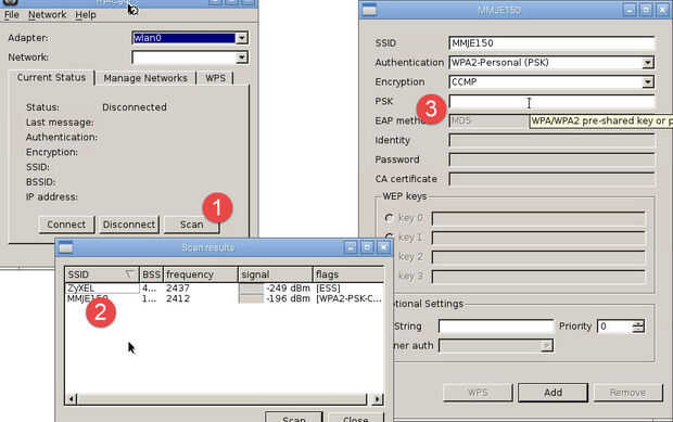 Pulse el botón [Scan] - Seleccione su red inalámbrica y escriba su contraseña en la casilla al lado de PSK - ver imagen