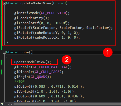 A continuación, el primer glRotatef() es responsable de la rotación en el eje Y. La segunda glRotatef() es responsable de la rotación en el eje X.