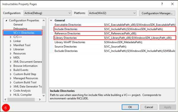 6) a directorios de VC ++ > haga clic en Incluir directorios y una voluntad de "..." aparece, haga clic en él y una nueva ventana se abrirá haga clic en el icono de nueva carpeta y dar la ruta a la carpeta de "Incluir" de tus archivos descargados (imagen 6), por ejemplo: