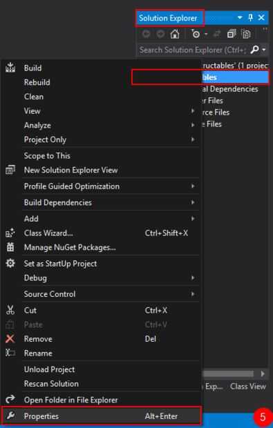 5) cuando se crea el proyecto, vaya a "Explorador de soluciones" > haga clic derecho sobre el nombre del proyecto >seleccionar propiedades(imagen 5).