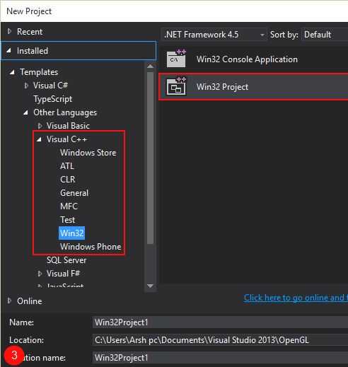 2) ir a instalado > otras lenguas > Visual C++ > Win32, nombre su proyecto y pulsa "Ok" (imagen 3)