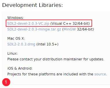 1) ir a https://www.libsdl.org/download-2.0.php y descargar librerías de desarrollo de C++ Visual "DS2-devel-2.0.3-VC.zip" como se muestra en la (imagen 1).