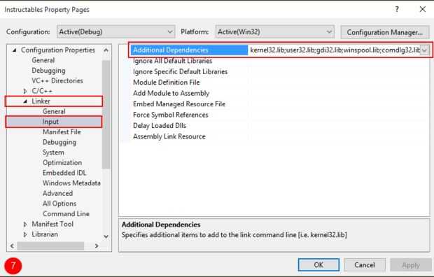 7) ahora ir a la vinculador > entrada > dependencias adicionales, haga clic en la Flecha abajo y seleccione "Editar", agrega el nombre del archivo lib, es decir tipo "SDL2.lib; SDL2main.lib; SDL2test.lib;" con el punto y coma (imagen 7).