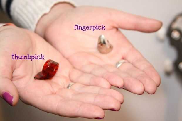 La Púa para pulgar debe ajustarse alrededor del pulgar con la parte plana debajo de la almohadilla del pulgar y el borde puntiagudo hacia afuera. Un ajuste correctamente Púa para pulgar debe no ir más lejos en el pulgar a la parte inferior de la miniatura.