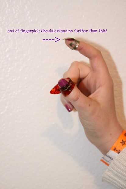La segunda imagen muestra lo que deben buscar las fotos en su mano rasgueos. Como se muestra en la imagen, al final de la fingerpick no debe extenderse más de unos pocos milímetros más allá de la uña. Debe poder apretarse bien en la punta del dedo, porque un fingerpick demasiado grande podría obtener atrapado en una cadena y se quitó. Sólo tengo una púa para dedos actualmente, pero la mayoría de los jugadores utilizan una selección adicional en el dedo del índice (en la posición de la misma manera).