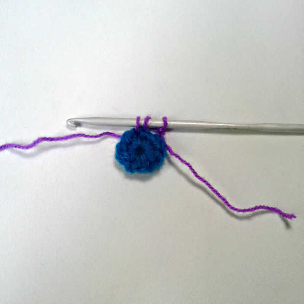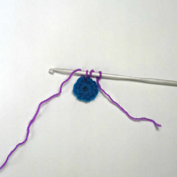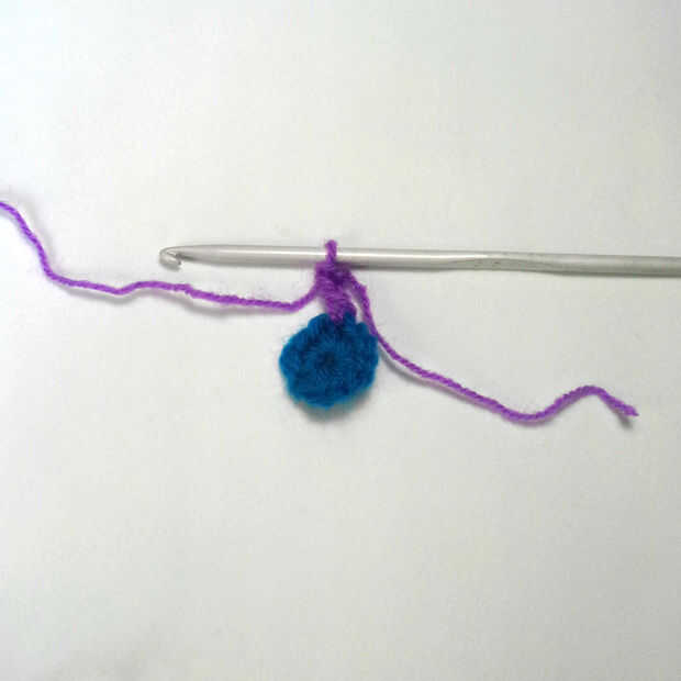 1. PIC 1: Hacer un lapsus nudo, entonces yo (lazo de sujeción con el pulgar si es necesario), introducir gancho en un punto de una sc base redonda (el azul redondo), yo y tire el hilo a través de. Ahora tienes tres lazos.
