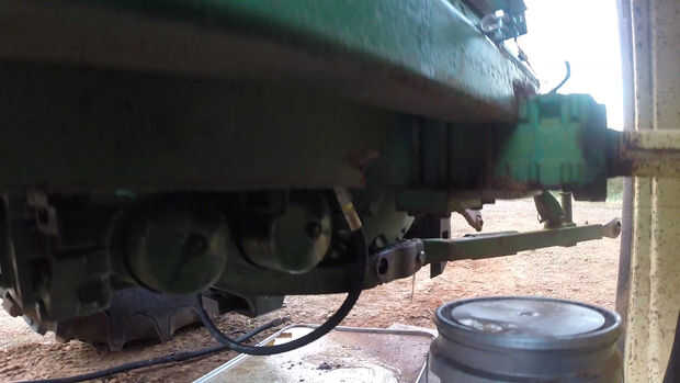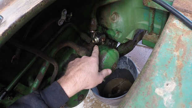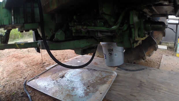 - Coloque un balde debajo del tractor para recoger el líquido que va a salir. He perdido entre un 1 y 2 galones. (Dependiendo de si el cubo está limpio se podría reutilizar este líquido. Mi cubo no estaba limpio)