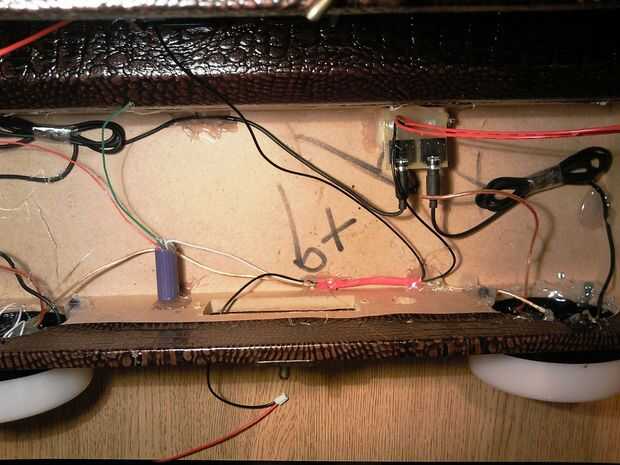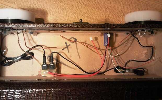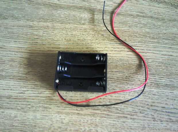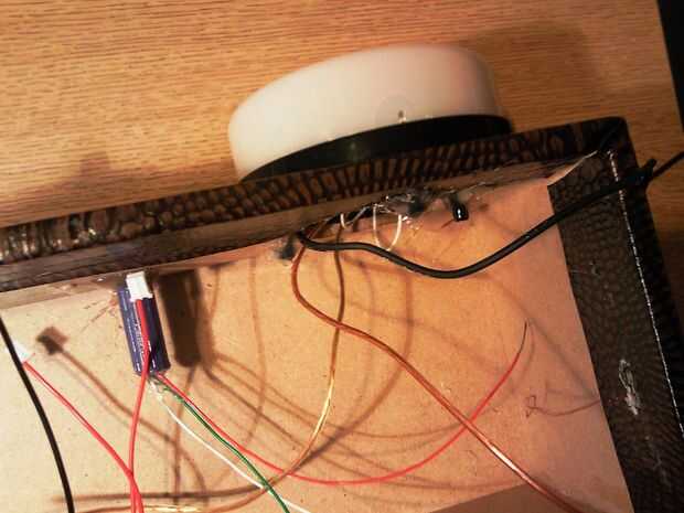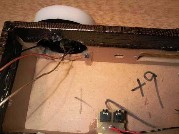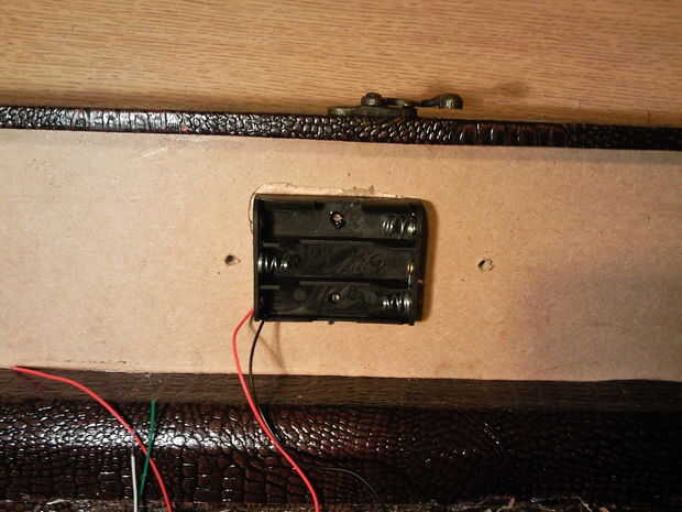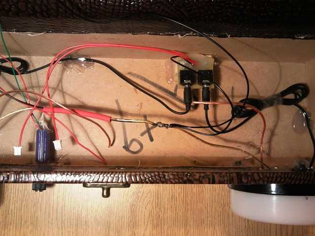 Después de las obras mencionadas, he montado y arreglado los altavoces - en primera les pegando con pegamento universal y después de que el montaje más fuerte por el uso de gran cantidad de pegamento caliente. El siguiente paso era hacer todas las conexiones terrestres y energía. El módulo MP3 no fue montado pero fue soldado el cable de alimentación junto con los otros. Como fuente de alimentación tenía la intención de usar 3 pilas de tipo AA. Para ello he arreglado una 3 AA tipo portapilas en la parte superior de la tapa de la caja por el uso de pegamento caliente. el cable negativo (uno negro) también fue soldado a la base común.