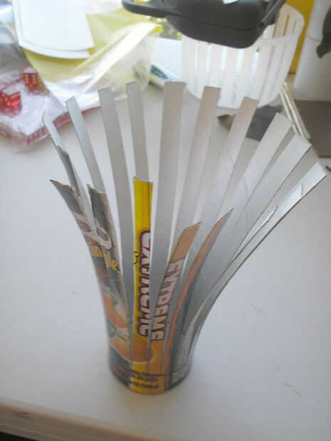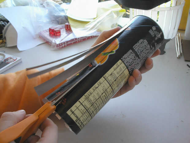 Con su regla, cortar a lo largo de las líneas de corte recto verticales y parar en la línea que dibujó alrededor de la circunferencia de la lata.