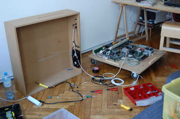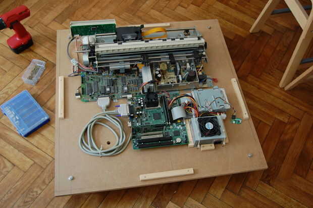 la última cosa a hacer era atornillar unas piezas de madera a la parte inferior para impedir que la parte superior de alrededor. después de esto todo se armó y la impresora fue probada con éxito. para mantener tan agradable como era que el caso fue pintado luego (claro).