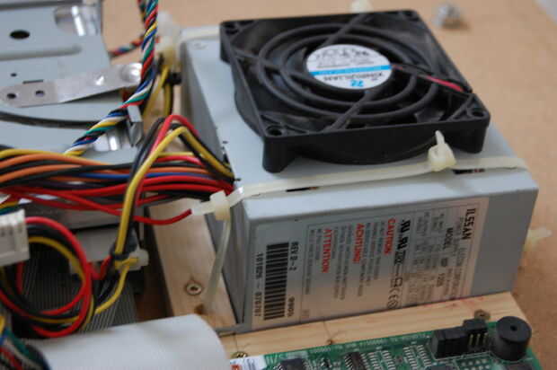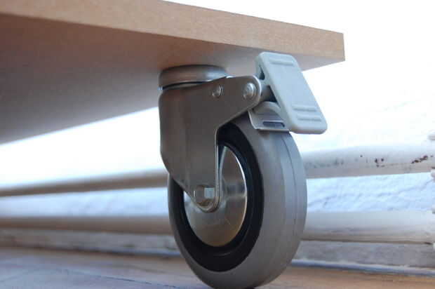 después de taladrar los orificios necesitados se montaron las ruedas en la parte inferior y cables sueltos y el transormer del ordenador se fijaban con bridas.
