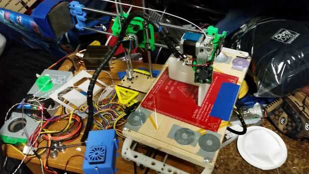 Mientras que estoy en ello debe utilizar una fuente de alimentación más grande para el Printrbot. Que viene con la impresora no tiene suficiente corriente para conducir una cama caliente. Usar fuente de alimentación ATX con dos carriles de 12V. Uno está conectado con el Printrbot y el otro larguero está conectado a la cama caliente con el interruptor de alta potencia. Puede utilizar dos pequeños ATX alimentación, 250W cada uno, para alimentar la placa. También querrás romper un carril de 12V para alimentar los ventiladores adicionales. Usé una placa proto con encabezados estándar para conectar los ventiladores en.