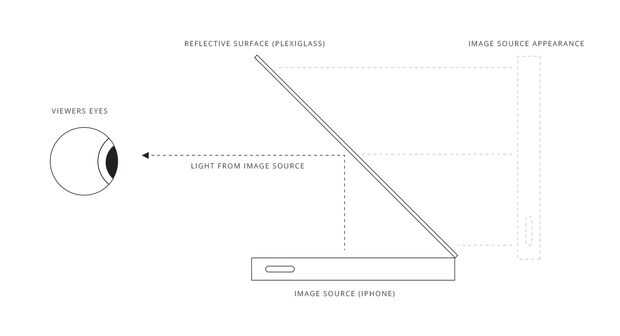Fantasma de la pimienta fue diseñado originalmente con una superficie reflectante en mente. A continuación encontrará un experimento que hice con una pieza transparente de acrílico (reflejando la generación de una imagen en un iPhone5). Tenga en cuenta que el acrílico es en ángulo de 45 grados en relación con la pantalla, el espectador es mirarlo directamente en (ángulo de visión de 0 grados) y que los pixeles negros del teléfono aparecen como transparentes.