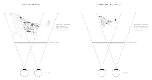 Al diseñar contenido para este sistema de visualización es importante ser consciente de las violaciones de la ventana. Una violación de la ventana es la aparición de un objeto cortado debido al tamaño de la ventana (o en nuestro caso el tamaño de la superficie reflectante). Cuando esto ocurre, la imagen parece que se ha cortado un trozo de él y el espectador pierde su suspensión de la incredulidad. Debido a esto, usando los objetos que son contenidos trabajo bien. Ejemplos de objetos independientes incluyen un árbol, coche, reloj, planeta, entre muchos otros. Objetos que funcionan menos bien serían algo así como un mano y el brazo. Para mostrar una mano a escala decente, el brazo se es probable que los bordes de la muestra y ya no se vería un objeto sólido flotando en el espacio. También es importante considerar la escala. Proyectar objetos pequeños como una obra fundamental muy bien porque se puede ver a escala real y son independientes de una manera que sería difícil recibir una violación de la ventana.
