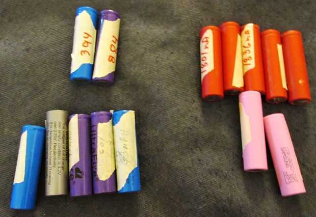 La mayoría de ellos eran 18650s barato comprado en ebay. (Púrpura, azul y gris los) Pero recientemente había comprado algunos Samsung más caro (rosados) para ver si eran mejores. Y hace poco desmonté un viejo paquete de baterías de portátil Lenovo que no era un cargo. (Los rojos)