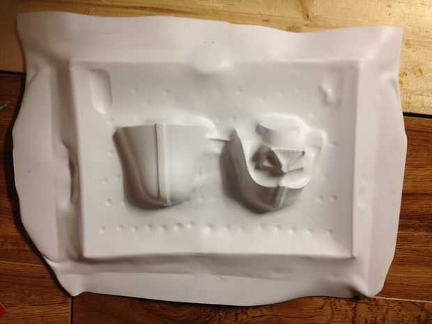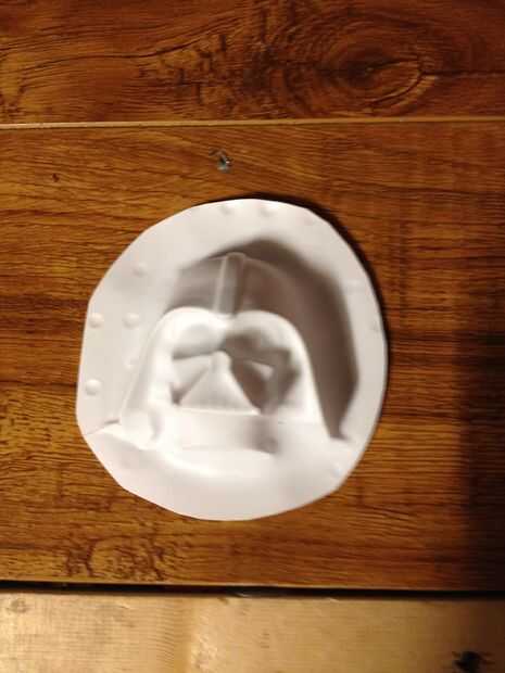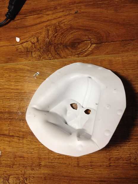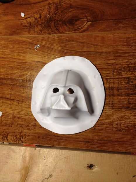 Me vacío forman una cáscara de una hoja de estireno 0.40. Resultó bastante bueno en mi opinión (que generalmente es bastante bajos pero esto resultó mejor de lo esperado). Corte la cáscara de Vader y recortar los ojos.