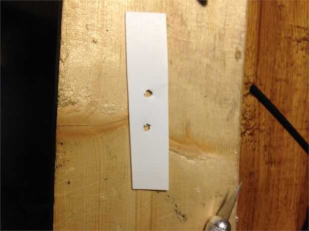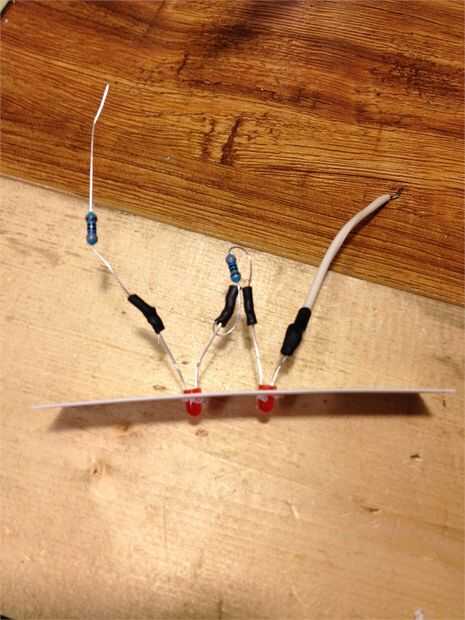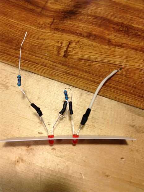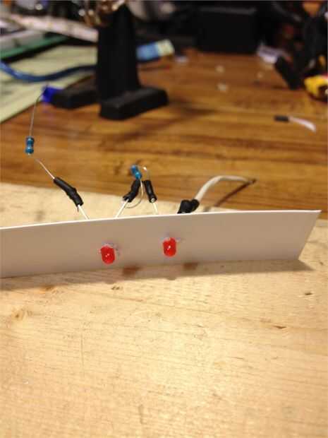 Luego tomó una tira de estireno y corte la longitud de la cáscara de Vader. Medido donde los ojos se alinean y cortan dos agujeros. Usé dos LEDs rojos con resistencias de 220 Ohmios soldadas en serie.
