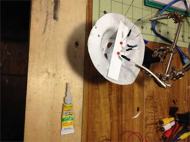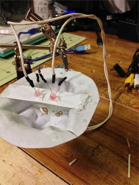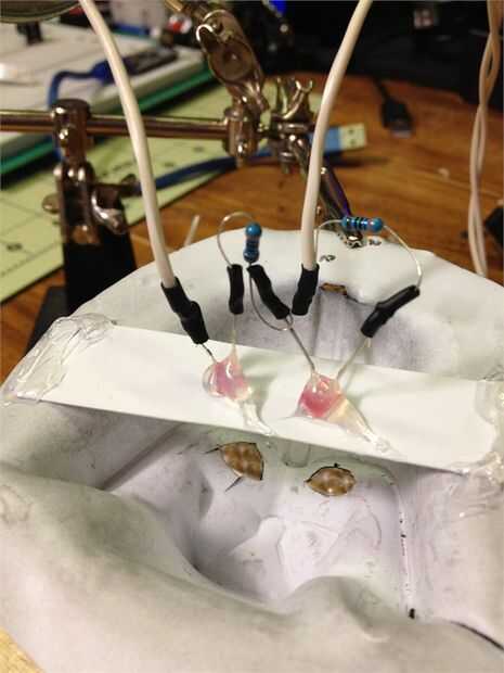Luego lo pegué al estireno en la shell de Vader. Me aseguré que soldar unos 6" de cable calibre 22 a cada conductor y tuve espacio para trabajar con él y no escasear.