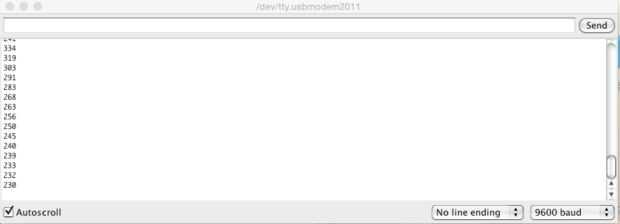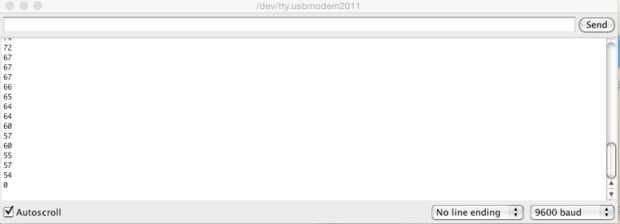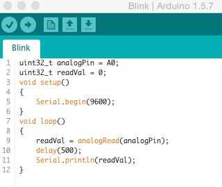 Ahora conectar el microcontrolador al ordenador y cargar el código anterior (ajustar el pin analógico y el ancho de banda de comunicación serial para adaptarse a).