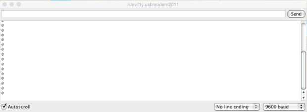 Después de que el código ha compilado y subido abra al monitor serie. Si los contactos están desnudos, debería ver una cadena de ceros. Si colocas un cable de puente entre los contactos debería ver un valor estable de 680. Si es así, el probador de continuidad está funcionando plenamente.