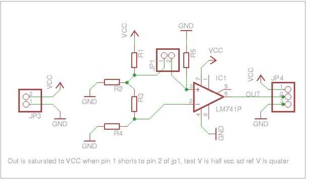 El sistema es simplemente un divisor del voltaje dual de la etapa y un comparador (op-amps funcionan bien y eso es lo que im usando por ejemplo. lm358). El primer divisor baja Vcc (por ejemplo 3v) hasta el elegido pruebas de tensión (por ejemplo 1v), que luego es reducido a la mitad con el segundo divisor (1v). el comparador (amplificador operacional) recibe el 1v en no-invertir-entrada (+) a través de los cables de prueba cuando se conectó por un cortocircuito, de lo contrario tirado por un 10k a tierra. La inversión de entrada (-) está conectado directamente a la segunda división. El comparador es alimentado por Vcc.