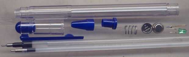 Primero reunirse las partes. Una luz verde diodo ha sido elegida porque su tensión es de unos tres voltios, alrededor del mismo valor que el de las células de dos botones cuando se conecta en serie. Las células de dos botones se han seleccionado de un tamaño lo suficientemente pequeño como para caber en el cuerpo de la pluma de bola. Las células LR41 que pude encontrar cabrían sólo dentro de la tapa de mi bolígrafo, pero usted podría ser capaz de encontrar células más pequeñas - o una pluma más grande. Diversas otras partes también tienen, como un resorte a pulsar las dos células para hacer contacto eléctrico, cables y un clip de cocodrilo. Pinza cocodrilo hará demasiado, o tal vez prefiera dejar la punta del cable pelado un poco. Un perno de la soldadura o pieza similar rígida de alambre se requiere para la punta de la sonda. Si desea utilizar una aguja o clavo de acero se advirtió que podría resultar imposible soldar.