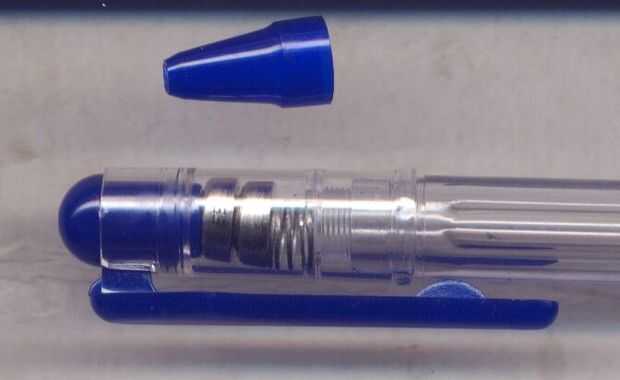 Compruebe que las dos células y primavera en la pluma. Hubiera podido descartar algunas partes y limar algunos bits para que encajen. La carcasa exterior de las células son sus terminales positivos. El terminal negativo es ese pedacito de metal que al final. El resorte debe colocarse en el lado positivo, para evitar el riesgo de los dos terminales están en cortocircuito juntos. Las dos células se colocan del mismo modo, con los extremos negativos hacia la primavera. Así: (-celular +)(-cell +)/\/\/spring\/\/