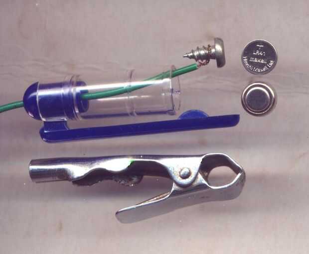 Derretir otro agujero en la parte superior de la tapa de la pluma, esta vez con alambre más grueso. Tome una longitud de alambre flexible y coloque un clip de lagarto o cocodrilo (dependiendo de qué lado de la quebrada en) hasta el final. Pasar el otro extremo del cable a través del agujero en la tapa (porque el clip es demasiado grande para pasar a través) y quitar el aislante por alrededor de una pulgada (unos 25,4 milímetros) y enróllelo alrededor de un tornillo corto de frente plano (o clavo) del contacto negativo de la batería.