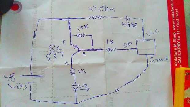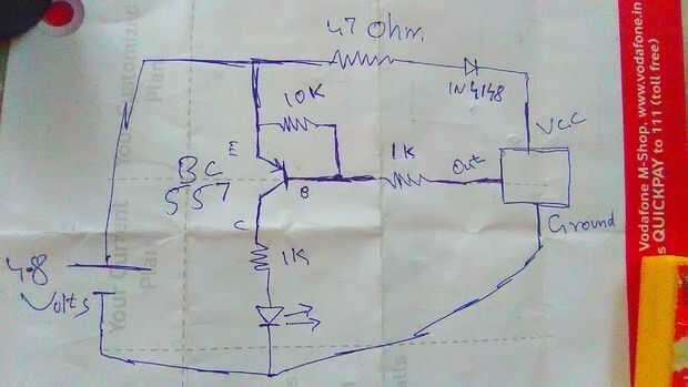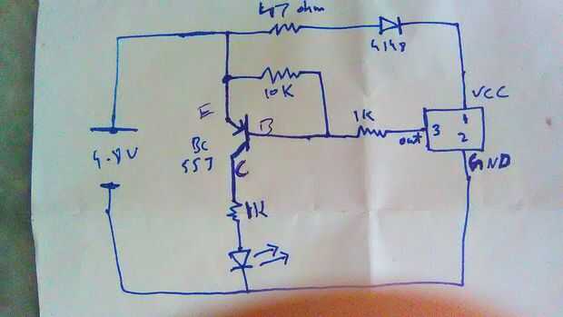 el positivo terminal de la fuente de alimentación está conectado a los 10K, 47 ohmios y emisor del transistor donde como terminal negativo de la batería es conectado al indicador led de sensor pierna e ir negativo tierra pierna y afterit pata positiva del led está conectado a la resistencia de 1K y esa resistencia de 1K otra pata está conectado a la pierna de colector del transistor BC557 y base del transistor está conectada a la resistencia de 10K otra pierna y 1K resistencia donde como resistencia de 1K otra pierna está conectada a la pata de salida del Sensor IR y ese resistor de 47 ohmios otra pierna está conectada el diodo IN4148 y otro pata del diodo se conecta a voltaje del Sensor de infrarrojos en la pierna.
