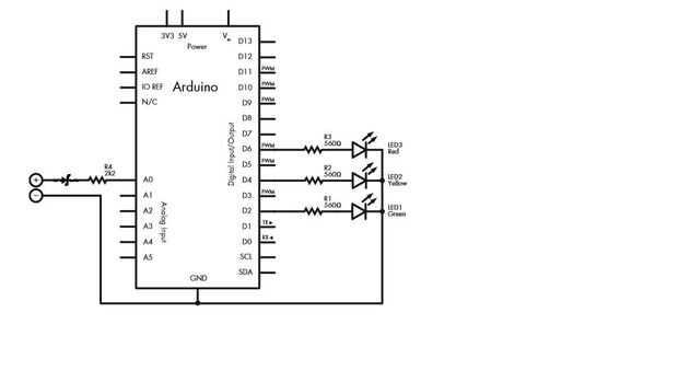 Adjunta es un diagrama esquemático eléctrico elaborado para el proyecto, cortesía de John Boxall en el taller de Arduino con mi además del Diodo zener ante la resistencia de 2.2 k. El arduino suministrará la energía del puerto USB, mientras que el voltaje de las baterías que se están probando decidirá que la luz se encenderá.