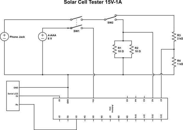 El medidor incluye dos circuitos de detección; uno para medir la tensión y uno para medir la corriente. Un interruptor de palanca SPDT (SW2) conecta la célula bajo prueba con estos circuitos individualmente.