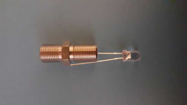Este es fácil. Asegúrese de que el lado negativo de su LED (generalmente la pierna corta, lado plano de la lente) es en el exterior del adaptador coaxial. La parte positiva de su LED va en el centro. Sólo esto envuelva con cinta aislante, o añadir el epoxi antes de envolver la cinta si realmente desea mantener segura.