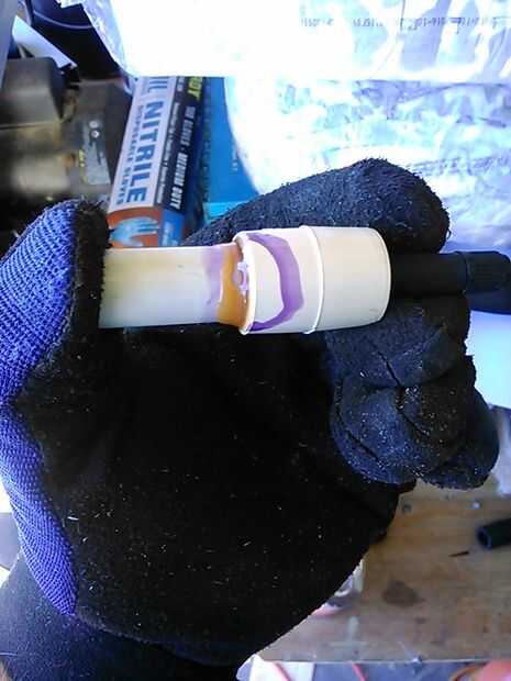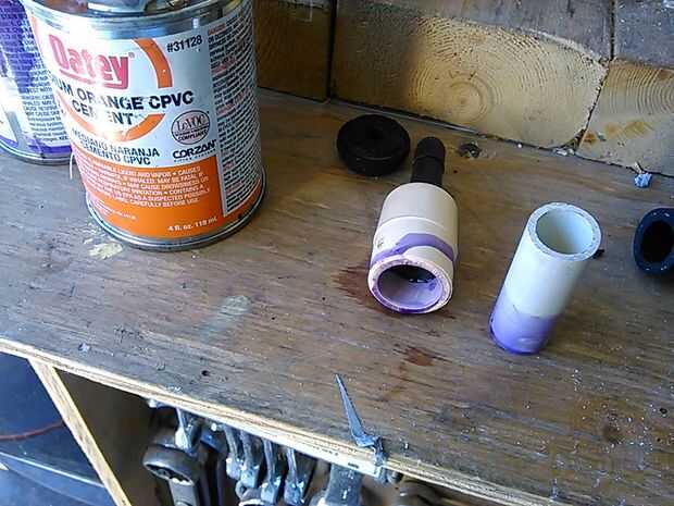 Ahora limpiar y pegar una de las longitudes de 2,5 pulgadas de los tubos CPVC de 1/2 pulgada en el mismo extremo y presiónelo en tan apretado lo que pueda y manténgalo apretado durante un minuto. (se trata de una rotura de la buena cerveza, manteniéndolo su)
