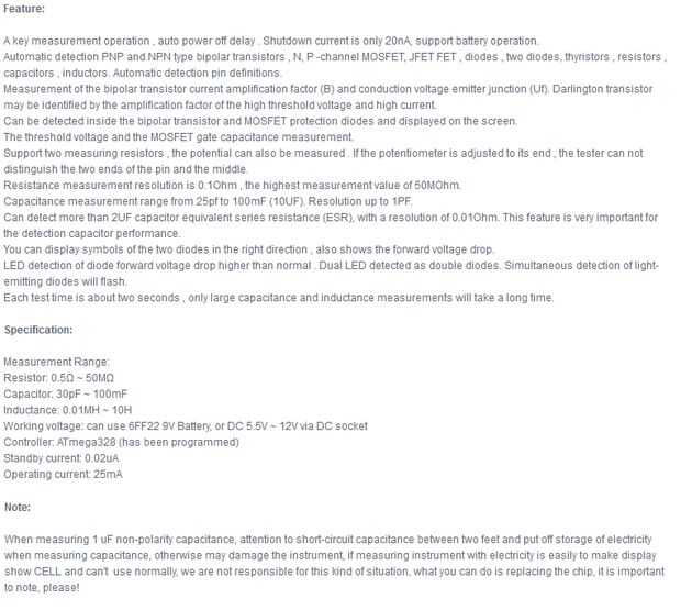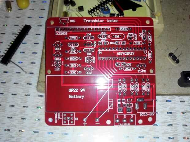El probador del transistor (realmente puede probar todos los componentes que ya sabes con 3 pernos) es muy fácil de construir, demasiado fácil para que salte la soldadura parte en este instructable. Todo lo que tienes que hacer es encontrar el valor del componente exacta, lugar, entonces la soldadura. Usted necesita solamente pagar un poco de atención en el interruptor del tacticle y el cuarzo cystal. Y que se sustituye la resistencia de 220 ohmios (control de luz de pantalla LCD) 2.2 k Ohms resistencia, que hacen que la pantalla se convierten en oscuras; simplemente reemplace con un resistor del ohmio 1 k.