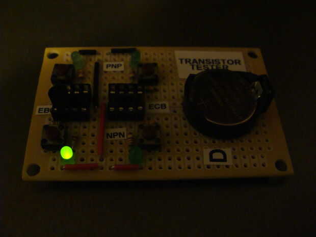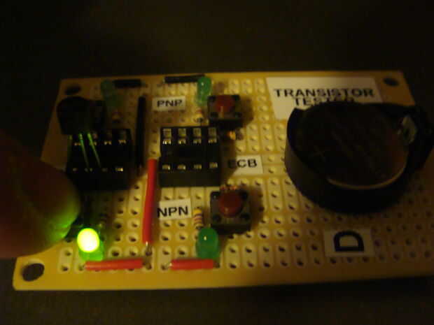 Nota: En el manejo de este instrumento que usted puede haber notado algo extraño suceda si toca la parte posterior del circuito, específicamente el puente el interruptor con el dedo. Si haces esto con el transistor correcta en la toma de corriente que el LED se ilumina sin presionar el botón. No te preocupes no es malo el circuito o el transistor, de hecho esto es bueno. El dedo está llevando a cabo una pequeña cantidad de corriente que es recogido por el transistor. El transistor, haciendo una de las cosas que está diseñado para hacer, recoge esta corriente pequeña y amplifica dejando paso actual a través de los LED. Así que durante la manipulación el probador de tratar de mantener los dedos de cepillar la parte posterior del probador para evitar lecturas falsas.