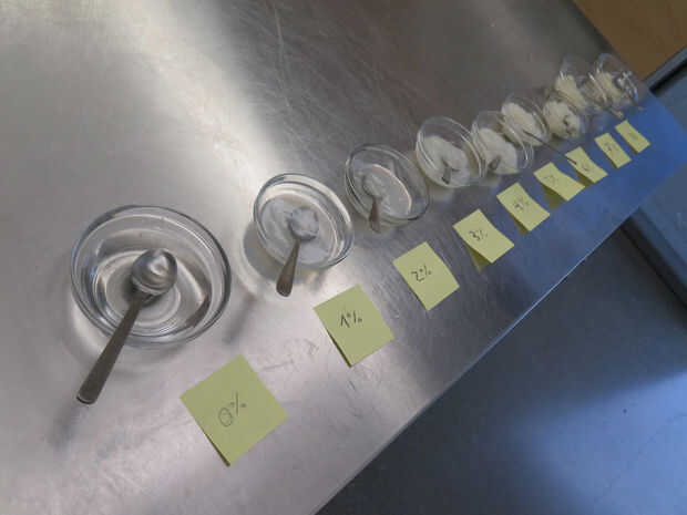 Los tres primeros cocientes tienen consistencia obviamente más gruesa que el agua, pero todavía puede fluir. 3% tiene tipo de textura de jarabe espeso. Del 4% al 8% no gotea fácilmente de la cuchara y tiene un aspecto más pastoso, aunque sea "mojada" y lejos de una textura de masa de harina. Es difícil que se describe. Es por eso que decidí grabar un vídeo para que sea más fácil de entender.